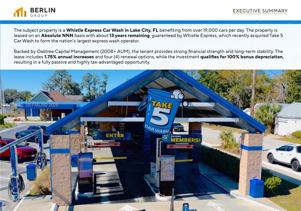 The subject property is a Whistle Express Car Wash in Lake City, FL benefiting from over 19,000 cars per day. The property is leased on an Absolute NNN basis with about 13 years remaining, guaranteed by Whistle Express, which recently acquired Take 5 Car Wash to form the nations largest express wash operator.Backed by Oaktree Capital Management (over $200 billion in assets under management), the tenant offers strong financial backing and long-term stability. The lease features 1.75% annual rent ...The subject property is a Whistle Express Car Wash in Lake City, FL benefiting from over 19,000 cars per day. The property is leased on an Absolute NNN basis with about 13 years remaining, guaranteed by Whistle Express, which recently acquired Take 5 Car Wash to form the nations largest express wash operator.Backed by Oaktree Capital Management (over $200 billion in assets under management), the tenant offers strong financial backing and long-term stability. The lease features 1.75% annual rent increases and four (4) renewal options, and the investment is eligible for accelerated depreciation, resulting in a fully passive and tax-efficient ownership opportunity.
